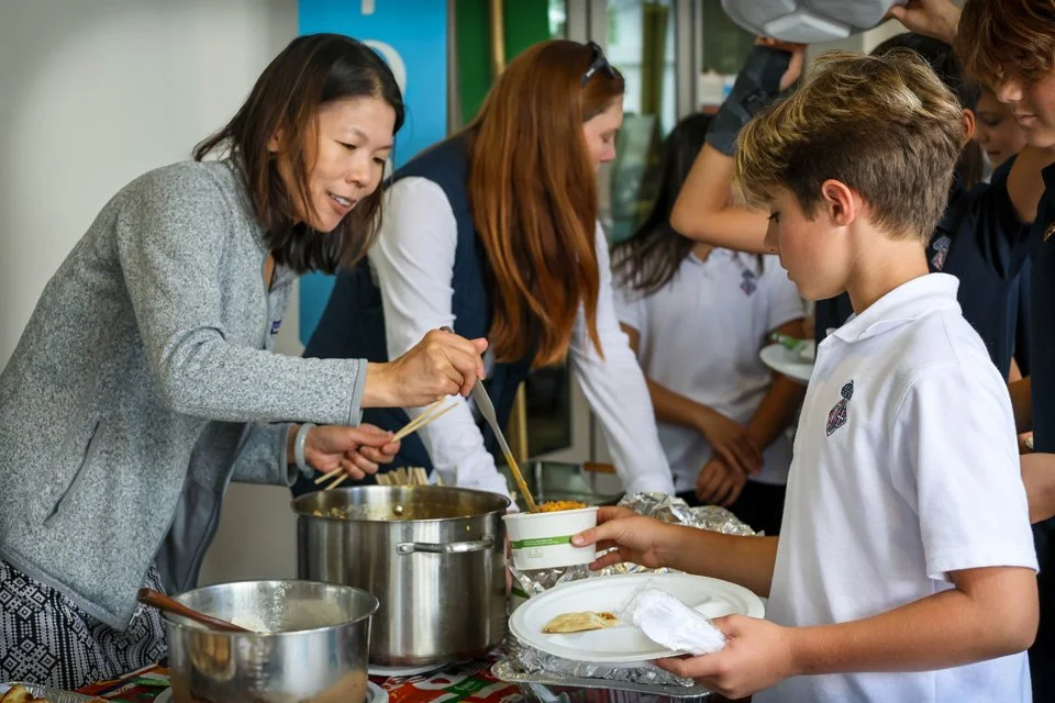 As students enter Middle School, food becomes more than nourishment—it becomes a lens for exploring identity, history, and belonging. That idea comes to life each year during the Heritage Feast, an interdisciplinary unit led by Middle School world history teacher Rian Otto and English teacher Owen Beitner. Through research, interviews and reflective writing, students investigate their family histories and cultural traditions, anchoring their learning in a meaningful family recipe. The project culminates in a festive campus gathering made possible by the deep involvement of parent volunteers and loved ones, who prepare and share dishes that reflect their heritage with the entire grade 6 community.
